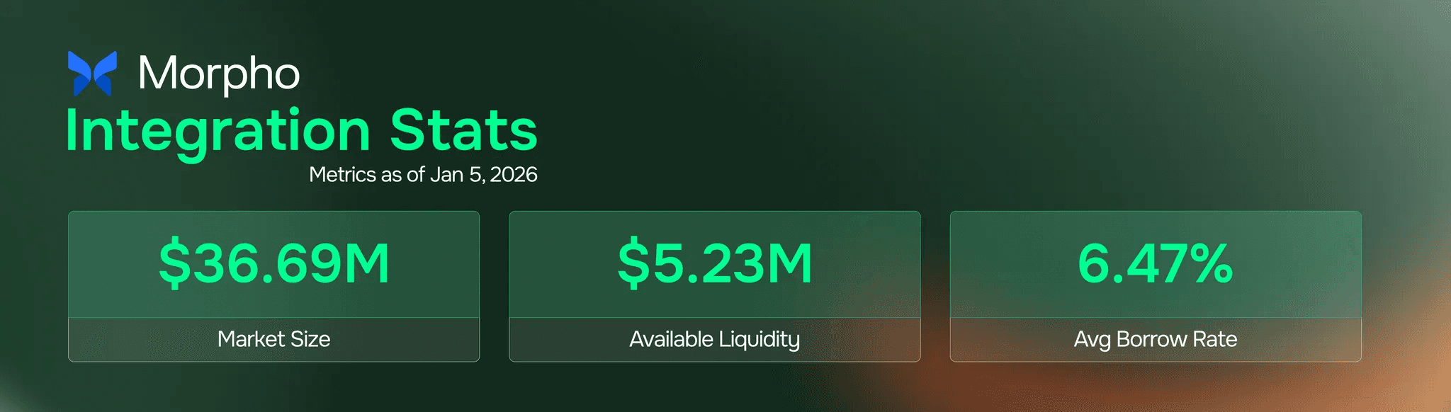 [Graphic: Morpho integration stats card showing "Market Size: $36.69M" | "Available Liquidity: $5.23M" | "Avg Borrow Rate: 6.47%"]